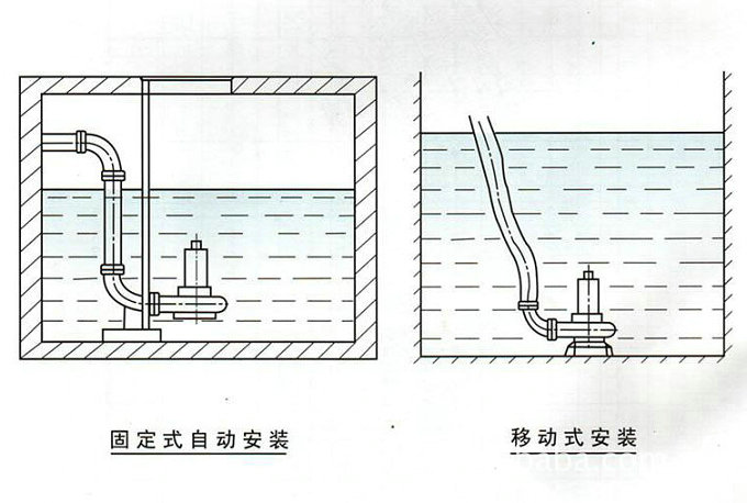 移動(dòng)式安裝指泵出口管路直接通過軟管連接至水面上,QW潛水排污泵靠自重置于水池底部或通過鐵鏈等懸掛在起吊裝置上。移動(dòng)式安裝無需耦合器和池底固定,便于移動(dòng),檢修時(shí)連管道一起起吊即可。同時(shí)由于安裝方式的原因,難以承擔(dān)大的力矩,只適用于小型的潛污泵。