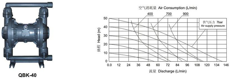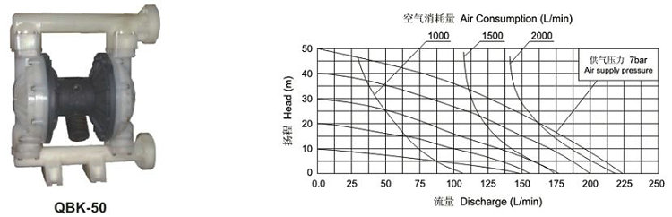 QBY-K-50新型工程塑料氣動隔膜泵揚程、流量可通過氣閥開度實現(xiàn)無級調(diào)節(jié)。(氣壓調(diào)節(jié)在1-7kg/c㎡之間)。
